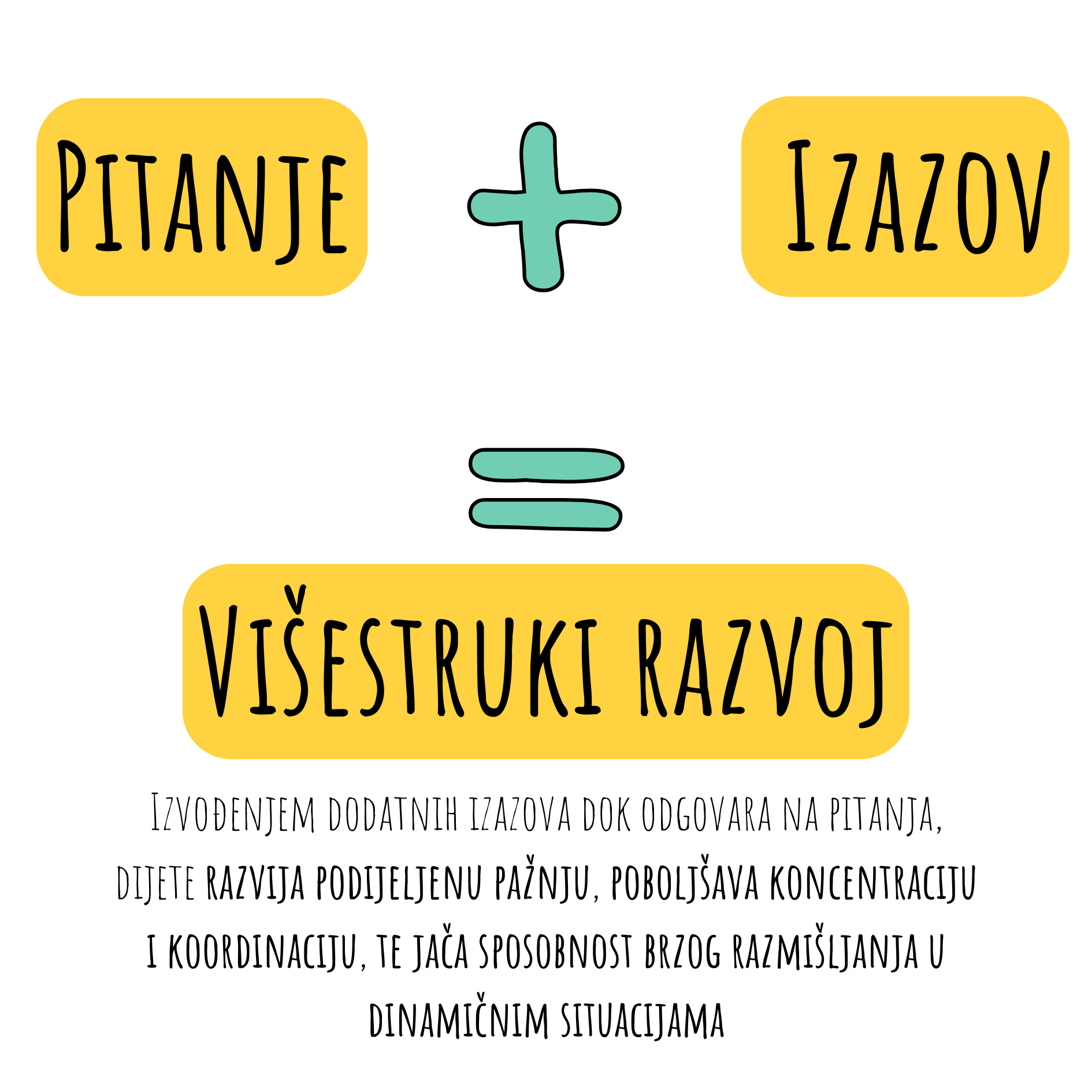 3. DODATNI FIZIČKI IZAZOVI DOK ODGOVARAŠ! Npr. stajanje na jednoj nozi, mačja poza, vrtnja u krug... Djeca tako razvijaju podijeljenu pažnju, koordinaciju i brzo razmišljanje.